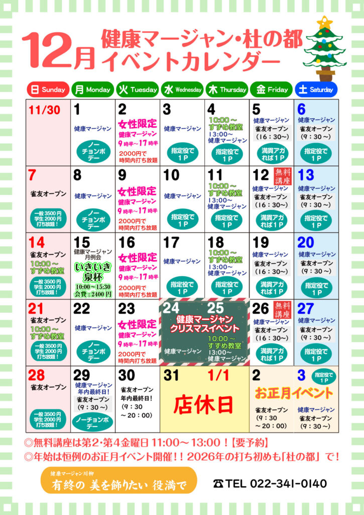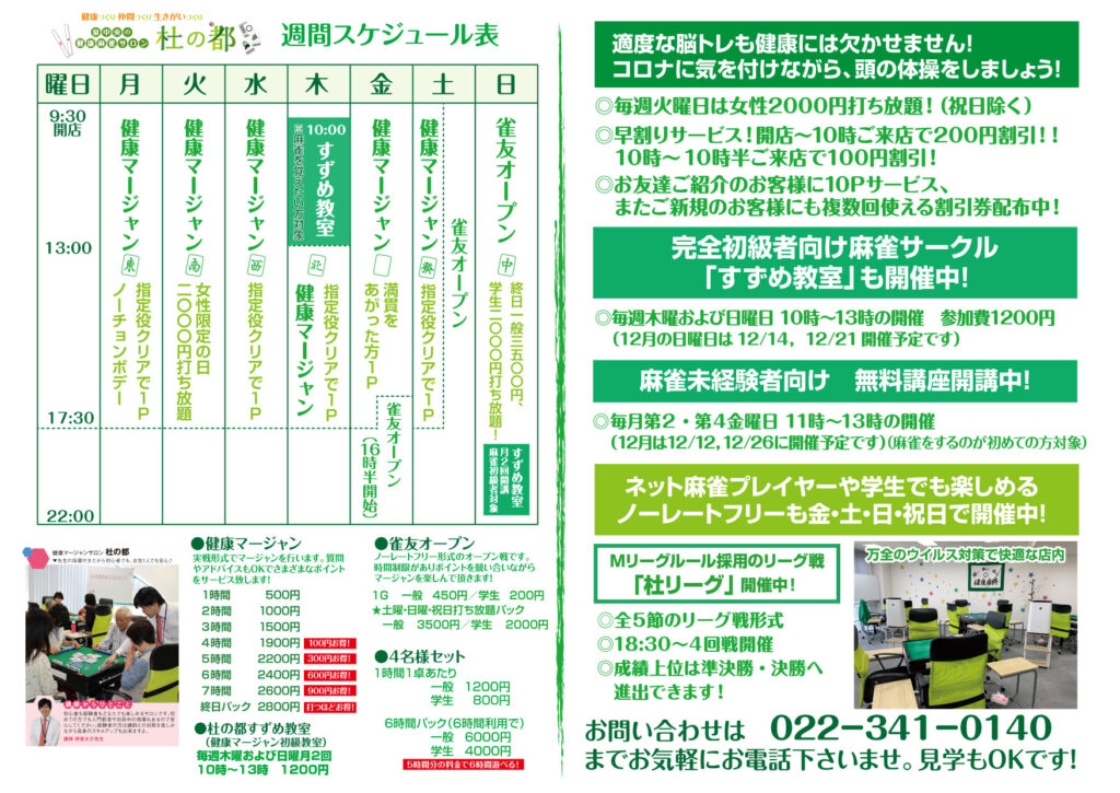 | 健康マージャン | 1時間500円 4時間1900円(100円お得!) 終日パック2800円(打つほどお得!) その他割引サービス多数あり |