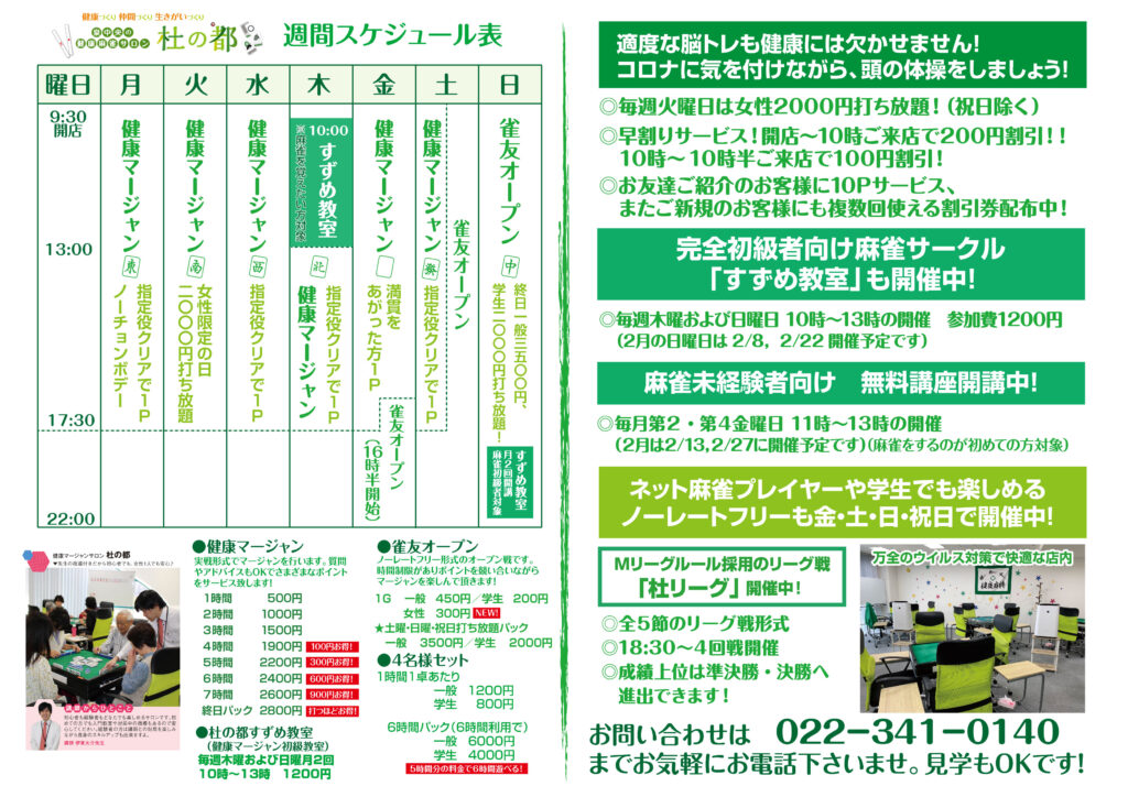 当店のノーレートフリーは引き続き、点数計算がわからない方やフリーに不慣れな方も安心してお楽しみいただき、真剣に楽しく麻雀をご遊技いただける環境を整えておりますので、この機会にぜひ一度「杜の都」へお越しくださいませ。